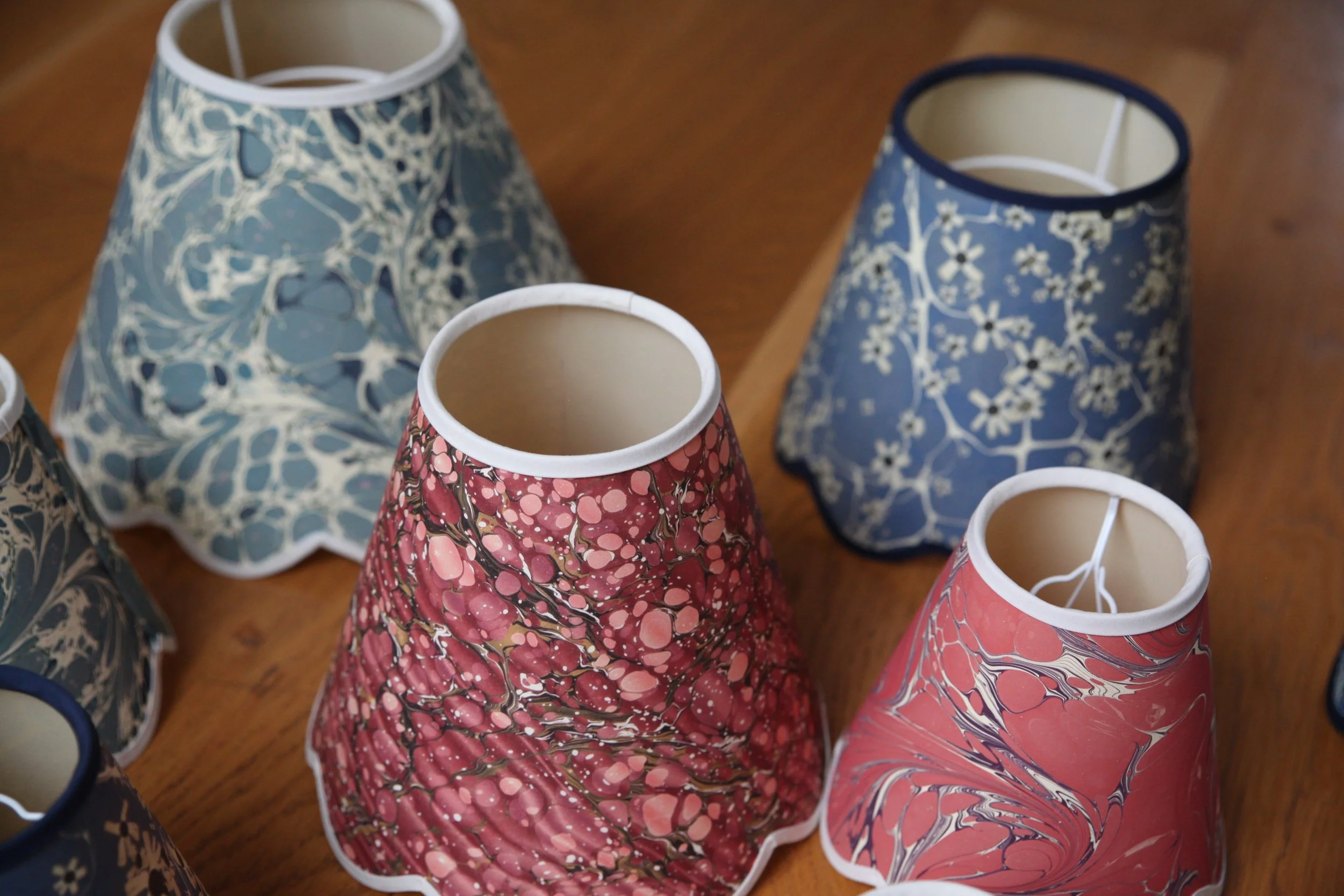 Marbling involves floating ink or paint on a surface to create interesting patterns which are then transferred onto paper. Bryony enjoys working with both digitally printed and hand marbled paper made by local artisans to craft beautifully patterned lampshades. Bryony is looking forward to introducing her own hand marbled paper designs to the website soon!